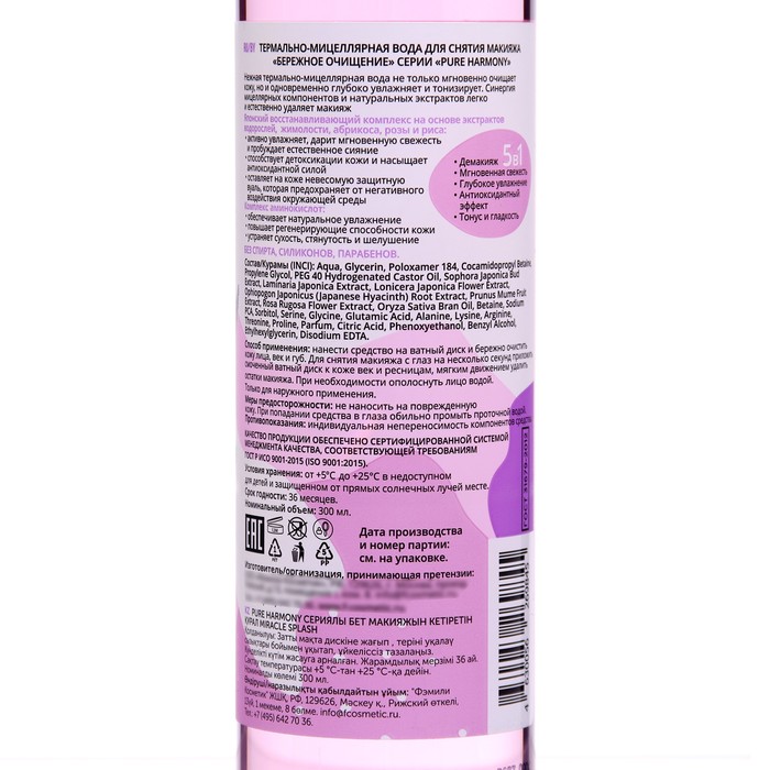 Состав: Aqua, Glycerin, Poloxamer 184, Cocamidopropyl Betaine, Propylene Glycol, Peg 40 Hydrogenated Castor Oil, Sophora Japonica Bud Extract, Laminaria Japonica Extract, Lonicera Japonica Flower Extract, Ophiopogon Japonicus (Japanese Hyacinth) Root Extract, Prunus Mume Fruit Extract, Rosa Rugosa Flower Extract, Oryza Sativa Bran Oil, Betaine, Sodium PCA, Sorbitol, Serine, Glycine, Glutamic Acid, Alanine, Lysine, Arginine, Threonine, Proline, Parfum, Citric Acid, Phenoxyethanol, Benzyl Alcohol, Ethylhexylglycerin, Disodium EDTA.