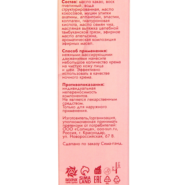 Состав: масло какао, воск пчелиный, вода структурированная, масло кокосовое, муцин улитки (натуральный аллантоин, эластин и коллаген), гиалуроновая кислота, масло семян чиа, масляная вытяжка тамбуканской лечебной грязи.