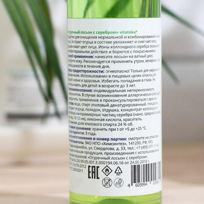 Состав: вода, спирт этиловый денатурированный, глицерин, экстракт огурца, полидон, отдушка, концентрат коллоидного раствора серебра(нано), лимонная кислота, краситель. Объемная доля этилового спирта 34% об.