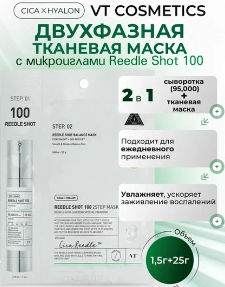 Усиленная двухфазная маска с микроиглами VT Cosmetics Reedle Shot 700 2Step Mask — это интенсивный бустер для домашнего ухода, состоящий из 2 этапов. Продукт разглаживает кожу, сокращает глубину морщин и сужает поры, повышает упругость и плотность. Отшелушивает роговой слой, способствует осветлению пигментации. Маска включает бустер-сыворотку Reedle Shot с высокой концентрацией микроигл и тканевое лекало: оба этапа ухода усиливают действие друг друга. Средство содержит микроиглы Cica Reedle™, комплекс Cicahyalon™, церамиды, эластин, EGF, пантенол и аминокислоты.