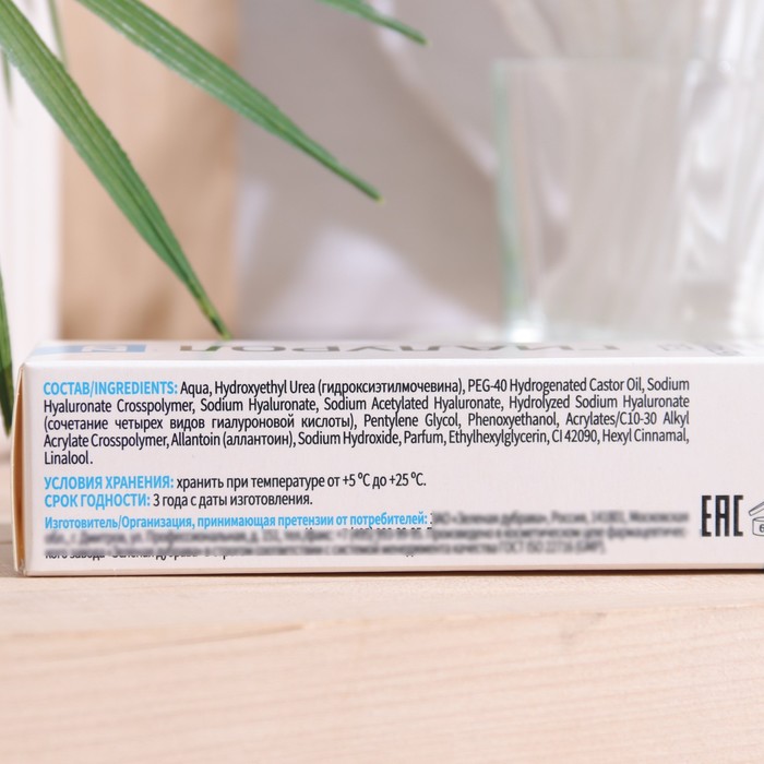 Состав aqua, hydroxyethyl urea (гидроксиэтилмочевина), glycerin (глицерин), panthenol (Д-пантенол), sodium hyaluronate (гиалуроновая кислота), phenoxyethanol, acrylates/C10-30 alkyl acrylate crosspolymer, allantoin (аллантоин), ethylhexylglycerin, sodium hydroxide.