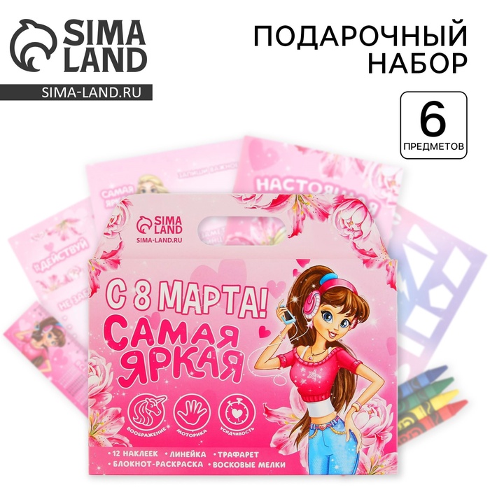 Подарочный набор, блокнот-раскраска, трафарет и восковые мелки «8 марта»