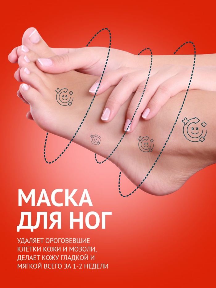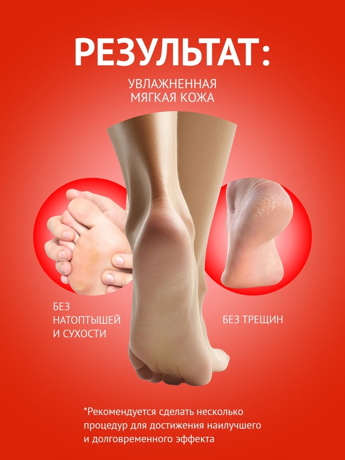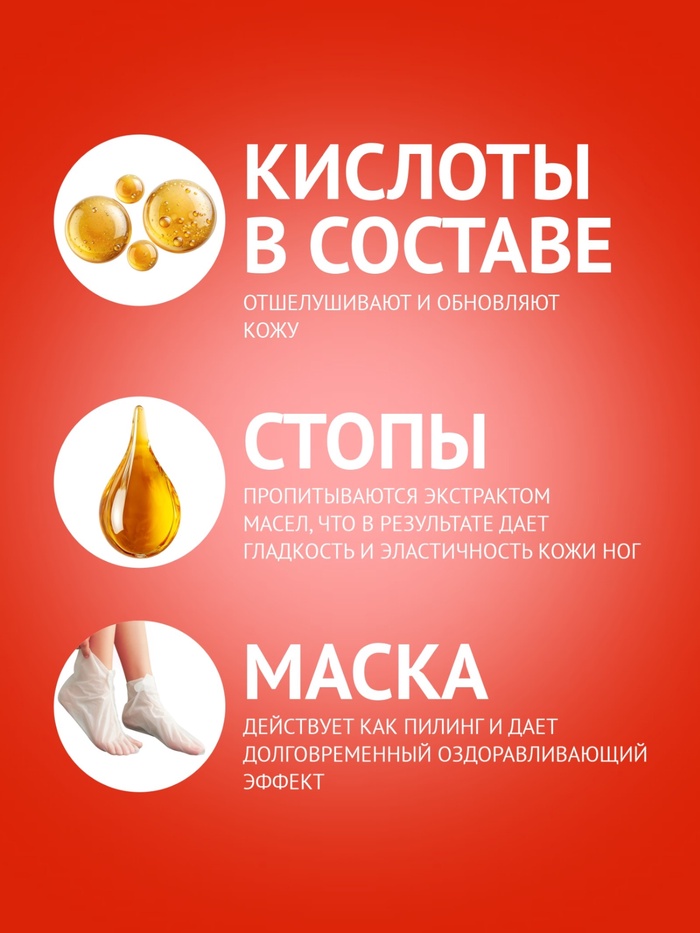 Способ применения: перед использованием тщательно вымойте и высушите ноги. Откройте упаковку и наденьте маску-носки. Рекомендуется надеть обычные носки поверх маски для лучшего контакта с кожей. Снимите маску для ног через 35-95 минут. Остатки средства смойте тёплой водой.