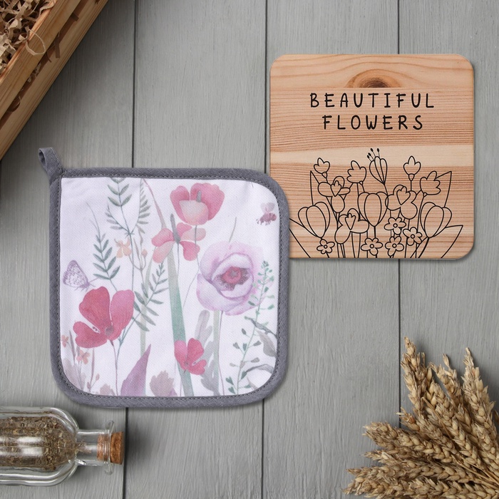 Набор кухонных аксессуаров с цветочным принтом — это практичный подарок для хозяйки и стильное дополнение для кухни. Комплект из прихватки и подставки под горячее создаёт гармоничный образ и помогает в ежедневных заботах. Плотный хлопок надёжно защищает руки и стол, сохраняя их в идеальном состоянии.