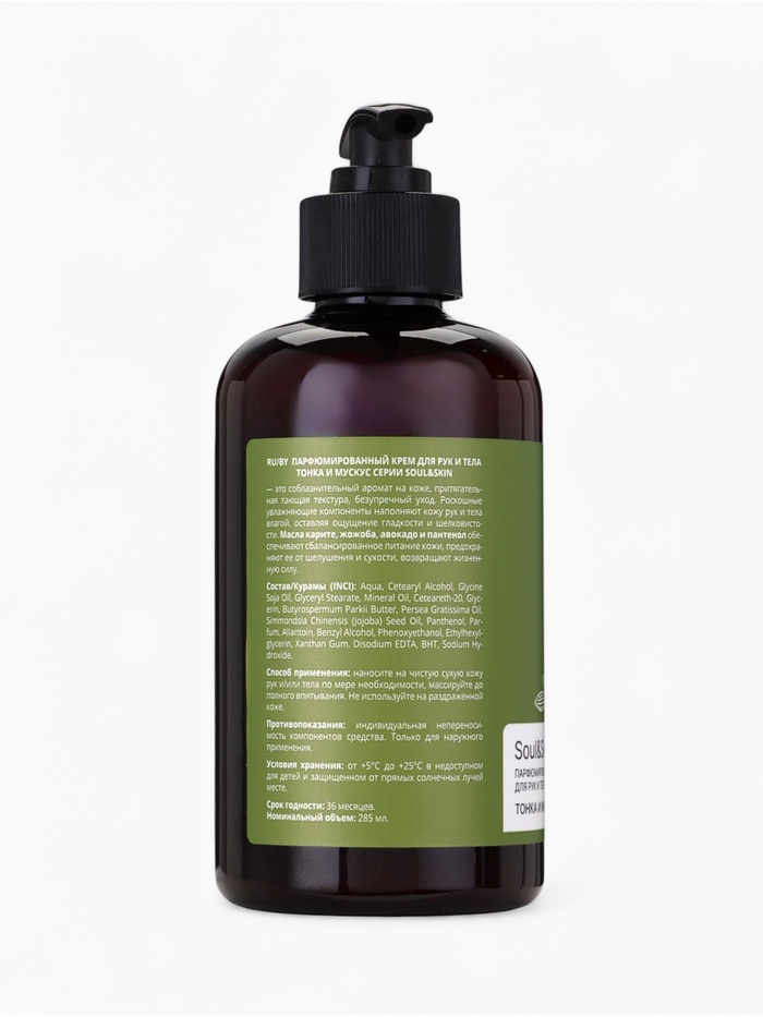 Роскошный крем с соблазнительным ароматом тонка и мускуса, обеспечивающий интенсивное увлажнение и питание кожи рук и тела.