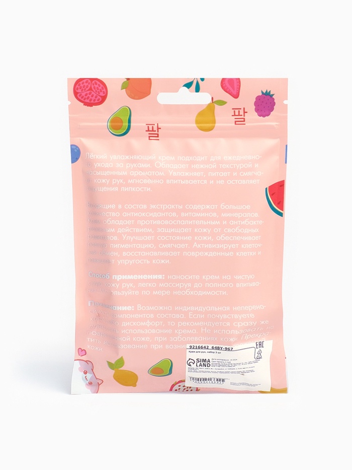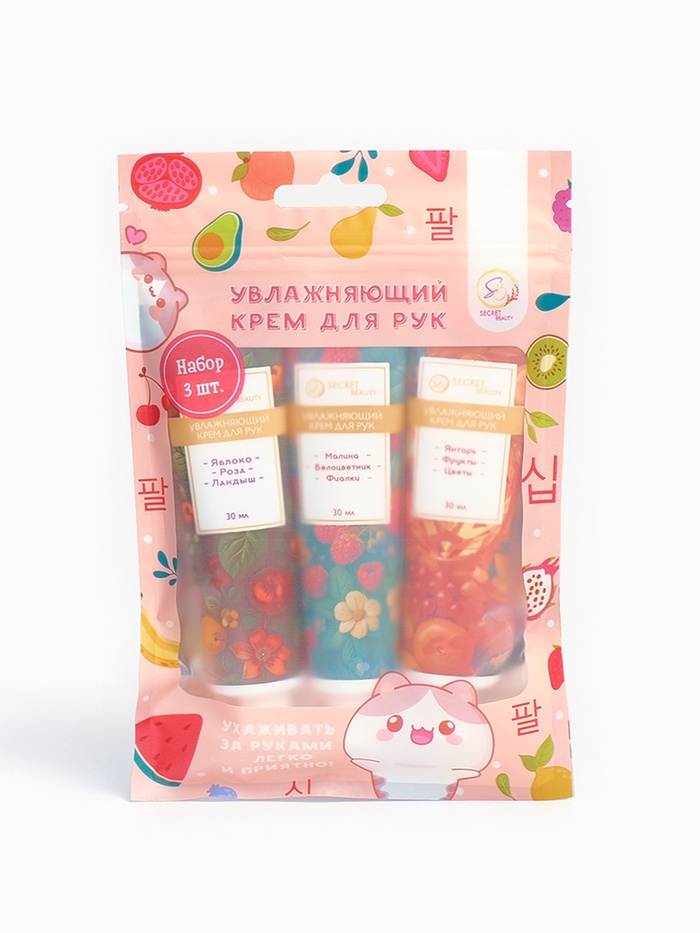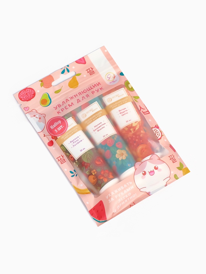 В набор входят увлажняющие крема: Крем для рук «Яблоко, роза, ландыш» 30 мл, Крем для рук «Цветы, фрукты, янтарь» 30 мл, Крем для рук «Малина, белоцветник, фиалки» 30 мл.