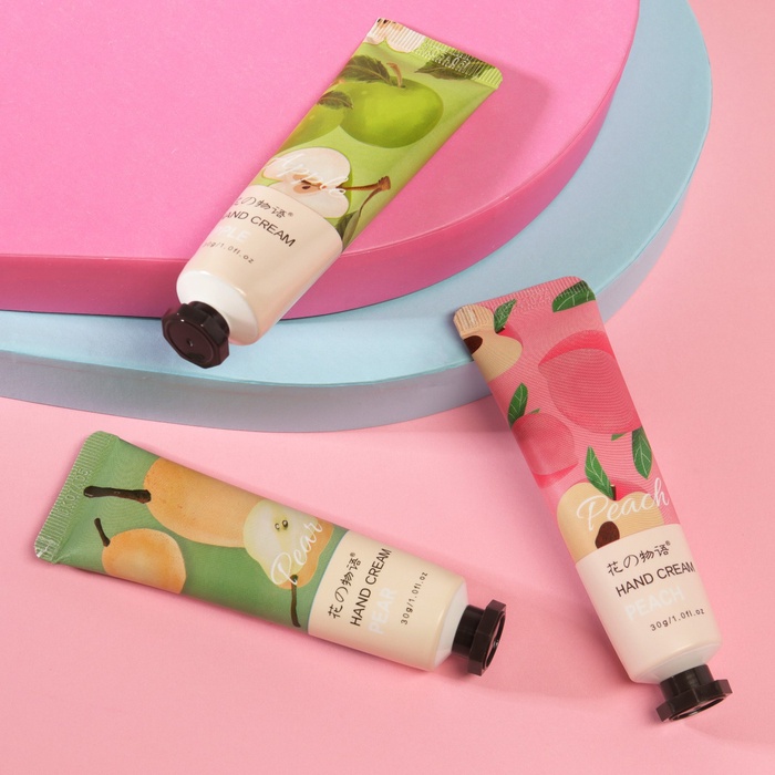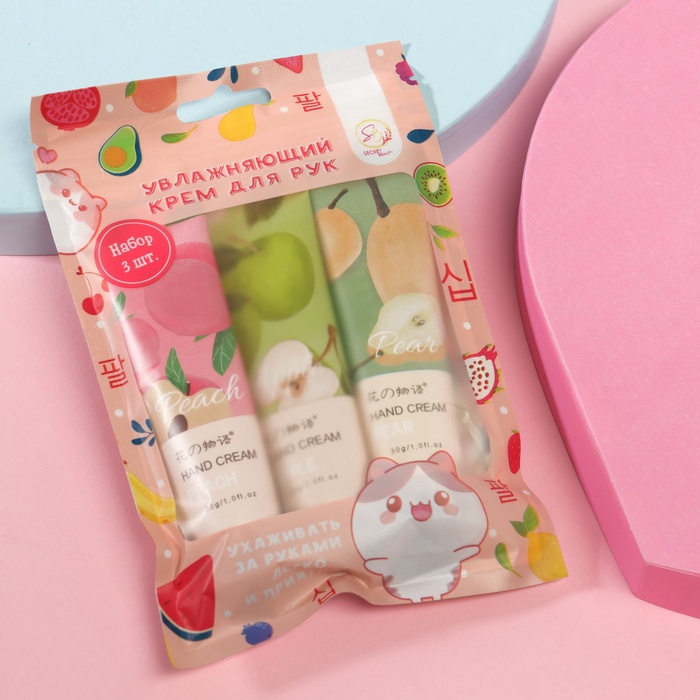В набор входят увлажняющие крема: Крем для рук «Персик» 30 мл, Крем для рук «Груша» 30 мл, Крем для рук «Яблоко» 30 мл.