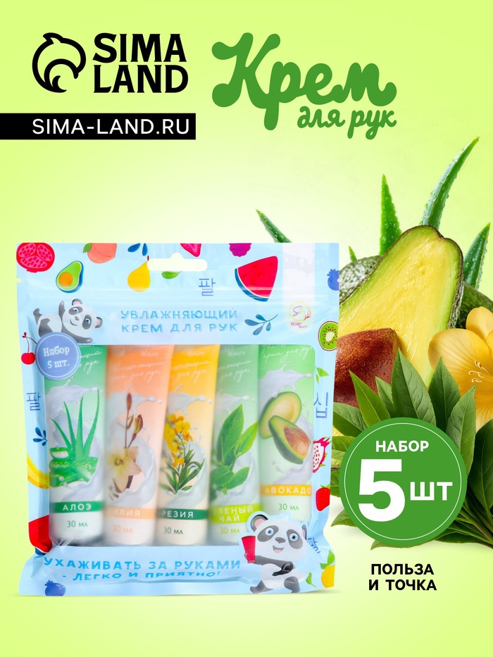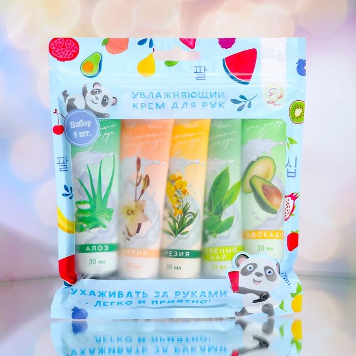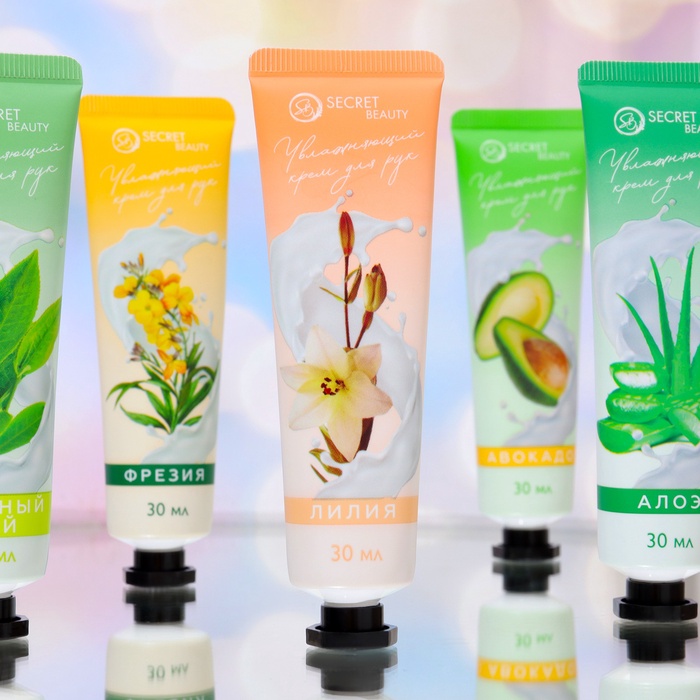 В набор входят увлажняющие крема: Крем для рук с экстрактом оливы 30 мл, Крем для рук с экстрактом ромашки 30 мл, Крем для рук с авокадо 30 мл, Крем для рук с алоэ вера 30 мл, Крем для рук с витамином Е 30 мл.