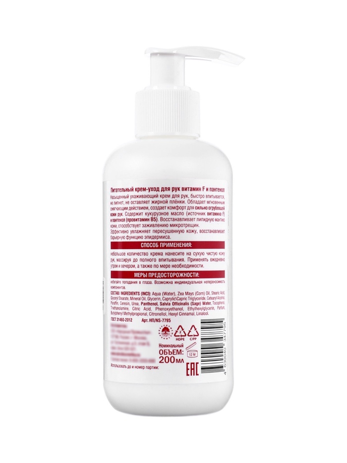 Насыщенный питательный крем для рук NOVOSVIT с витамином F и пантенолом предназначен для интенсивного ухода за сильно огрубевшей, пересушенной и чувствительной кожей. Крем быстро впитывается, не оставляет липкой или жирной плёнки и обеспечивает моментальное смягчение кожи, создавая ощущение комфорта.
