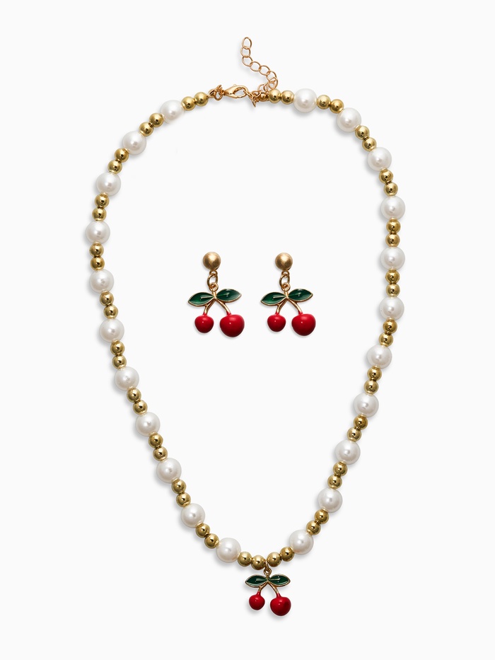 * Гармония стилей: каждая деталь комплекта изготовлена с вниманием к деталям, сочетая белый цвет жемчуга с тёплым блеском золота и ярким красным оттенком подвески-вишни.