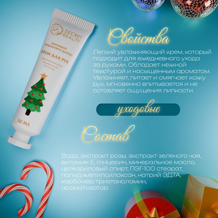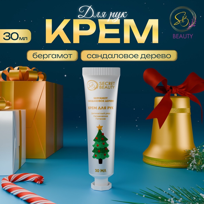 Крем для рук новогодний «Бергамот и сандаловое дерево», 30 мл от SB Beauty — это идеальный выбор для новогоднего подарка, который сочетает в себе нежный уход за кожей и праздничную атмосферу. Сочетание освежающего аромата бергамота и теплоты сандалового дерева наполняет зимние дни уютом и комфортом, а текстура крема быстро впитывается, не оставляя жирного следа.