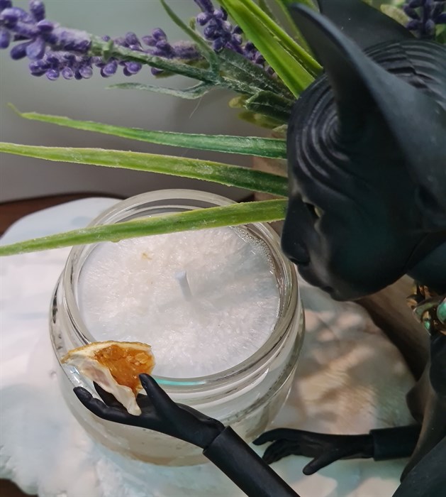Откройте крышку, глубоко вдохните аромат свечи. Снимите фруктовый декор. Зажгите свечу, через 5-7 минут образуется достаточное количество теплого масла. Нанесите теплое масло на кожу рук и ног и распределите по телу легкими массажными движениями. Желательно использовать на увлажненной гидролатом коже.