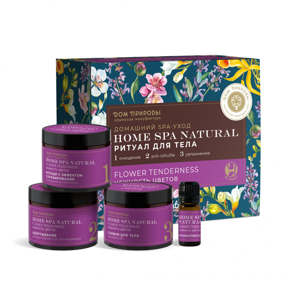 1 шаг Очищение Бьюти-терапия начинается с очищения кожи с помощью бельди с эффектом скрабирования «Очищение и упругость». Микрочастицы перлита деликатно скрабируют кожу, удаляя отмершие клетки. Масло жожоба обладает омолаживающим действием. Нанесите бельди на разогретую влажную кожу. Используйте для очищения мочалку из набора. Остатки средства смойте теплой водой. 2 шаг Обертывание Теперь кожа готова к воздействию антицеллюлитного обертывания с питательными маслами и бело-голубой глиной. Ментол создает легкий охлаждающий эффект. Обертывание стимулирует кровообращение, выравнивает рельеф кожи. Нанесите средство на сухую кожу, оберните пленкой для более интенсивного воздействия. Через 20-25 минут смойте водой и вытрите кожу полотенцем. 3 шаг Увлажнение Нежные кремовые сливки «Увлажнение» с маслами ши, миндаля и экстрактом фиалки - идеальное завершение домашнего SPA-ухода для тела. Дарят коже увлажнение, мягкость и тонкий цветочный аромат. Нанесите сливки на сухую кожу и дайте им впитаться. Придайте ритуалу аромат: добавьте аромаэликсир в воду, аромалампу или просто капните на запястье. Легкий и нежный цветочный аромат с выделяющимися аккордами вишни, фрезии и лотоса погрузит вас в атмосферу неги и релакса.