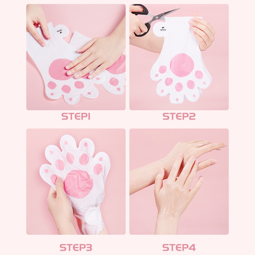 Способ применения:1. Тщательно вымойте руки перед применением средства и промокните их полотенцем. 2. Наденьте маску как обычные перчатки и закрепите.3. Для лучшего впитывания средства помассируйте руки. 4. Через 15-20 минут снимите маску с обеих рук и ещё раз помассируйте их для закрепления эффекта до полного впитывания остатков средств.ьная и осветляющая маска для рук на тканевой основе в виде кошачьей лапки предназначена для глубокого увлажнения, смягчения, осветления, восстановления поврежденной, огрубевшей, обветренной кожи рук.
