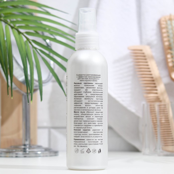 Сыворотка предназначена для жестких, вьющихся и непослушных волос. Рисовые протеины насыщают волосы полезными микроэлементами, увлажняют волосы, придают им эластичность, обладают глубоким питательным действием и предотвращают образование секущихся кончиков. Активные молекулы протеина обладают антистатическим эффектом, предотвращают спутывание волос, облегчая расчесывание и укладку даже на жестких и непослушных волосах. Масло льна образует защитную пленку, оберегающую волосы от воздействия ветра и перепадов температур, снижает повреждения при термоукладке и завивке. Благодаря его действию волосы cтановятся гладкими и приобретают зеркальный блеск. Конский кератин укрепляет и восстанавливает внутреннюю структуру волос, разглаживает их, придает эластичность и упругость.