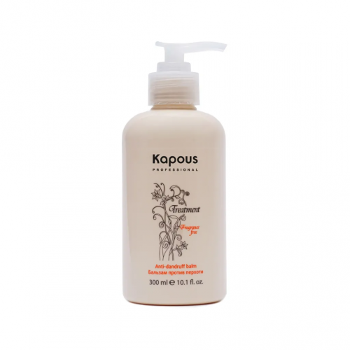 KAPOUS ( Капус ) Серия «Fragrance free» не имеет парфюмированных добавок. Бальзам сглаживает структуру волос, обеспечивает гладкость. Пантенол, масло Чайного дерева и Токоферол увлажняют и регенерируют поврежденные участки волос, снимают статическое напряжение. Для максимально эффективного результата рекомендуется применение комплекса препаратов против перхоти серии "Treatment": шампунь, бальзам и лосьон в ампулах Active plus одновременно.