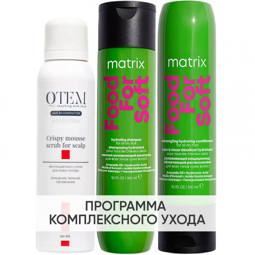 MATRIX ( МАТРИКС ) В набор входят пять средств. Набор не имеет внешней упаковки, товары вкладываются в заказы по отдельности. ШАГ 1 ОЧИЩЕНИЕ 1. Увлажняющий шампунь для сухих волос Food For Soft, 300 мл Мягкий шампунь Food For Soft - это очищающий и увлажняющий уход для сухих волос. Бережно очищает волосы и кожу головы от возможных загрязнений. Для наиболее эффективного увлажнения и удержания влаги внутри волоса в состав шампуня добавлены гиалуроновая кислота и масло авокадо. Применение: намочите волосы. Нанесите на волосы небольшое количество шампуня. Вспеньте шампунь массирующими движениями, пока он не вспенится. Тщательно смойте шампунь с волос. 2. Увлажняющий кондиционер для сухих волос Food For Soft, 300 мл Кондиционер Food For Soft - это распутывающий и увлажняющий уход для сухих и ломких волос. Для наиболее эффективного увлажнения и удержания влаги внутри волоса в состав кондиционера добавлены гиалуроновая кислота и масло авокадо. Восстанавливается баланс влаги, волосы становятся более мягкими, возвращается здоровый блеск. Применение: нанесите кондиционер на чистые влажные волосы, начиная с середины длины до кончиков. Оставьте на 1-3 минуты. Смойте кондиционер с волос. Нанесите масло. 3. Хрустящий скраб для кожи головы SOS Systeme, 150 мл Охлаждающий и очищающий мусс освежает кожу головы, питает и увлажняет. Подходит для всех типов волос. Средство потрескивает при применении. Применение: встряхните скраб перед использованием. Держите флакон в вертикальном положении. Нажмите на клапан. Чтобы использовать все содержимое, необходимо повернуть флакон под углом 90 градусов. Только наружное применение. Используйте перед или после мытья шампунем в зависимости от проблематики. ШАГ 2 ДОПОЛНИТЕЛЬНЫЙ УХОД 1. Маска для глубокого питания и увлажнения сухих волос Food For Soft, 500 мл Профессиональная маска Matrix Food For Soft для питания сухих и пористых волос обеспечивает увлажнение сухих и очень сухих волос, делая их мягкими и шелковистыми. Не утяжеляет волосы у корней. Сочетает в себе свойства бальзама-ухода, восстанавливая баланс влаги внутри пересушенных и пористых волос, а также делая пряди мягкими и эластичными. Применение: нанести маску от середины длины до концов. Оставить на 3-5 минут. Смыть. 2. Многофункциональное масло-сыворотка Food For Soft, 50 мл Многофункциональное масло Food For Soft - это интенсивный увлажняющий уход для сухих и пористых волос. Для эффективного удержания влаги внутри волоса в состав добавлено масло авокадо. Закрывает кутикулу волоса водоотталкивающей пленкой, таким образом предотвращая потерю влаги. Обеспечивает термозащиту до 230?C, так что волосы не теряют влагу даже при сушке феном. Применение: нанесите несколько капель на влажные или сухие волосы после использования шампуня и кондиционера Food For Soft. Распределите по волосам и дайте впитаться. В набор входят пять средств. Набор не имеет внешней упаковки, товары вкладываются в заказы по отдельности. ШАГ 1 ОЧИЩЕНИЕ 1. Увлажняющий шампунь для сухих волос Food For Soft, 300 мл Мягкий шампунь Food For Soft - это очищающий и увлажняющий уход для сухих волос. Бережно очищает волосы и кожу головы от возможных загрязнений. Для наиболее эффективного увлажнения и удержания влаги внутри волоса в состав шампуня добавлены гиалуроновая кислота и масло авокадо. Применение: намочите волосы. Нанесите на волосы небольшое количество шампуня. Вспен