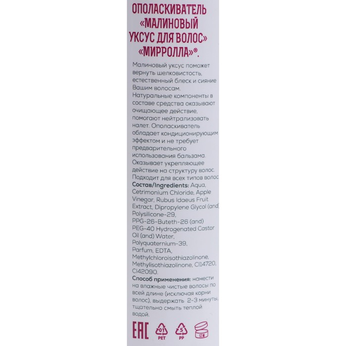 Малиновый уксус – традиционное средство, известное с давних времен, для придания глянцевого блеска и гладкости волосам. Ополаскиватель оказывает очищающее действие на волосы, убирая тусклый налет после применения различных косметических средств; восстанавливающее действие на поврежденную структуру волоса, предупреждая его иссечение и ломкость. Средство наполняет волосы ослепительным блеском, уплотняет их изнутри, дарит гладкость и шелковистость, облегчает процесс расчесывания и укладки. Подходит для любого типа волос. Не требует предварительного использования бальзама.