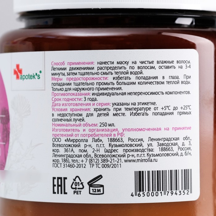 Репейная маска с комплексом протеинов на основе отвара корня лопуха укрепляет и восстанавливает волосы. Проникая внутрь волоса, протеины «заполняют» микроповреждения, обеспечивая мягкость и прочность полотна волос. Натуральное масло жожоба придаёт волосам мягкость, увлажняет и наполняет блеском.