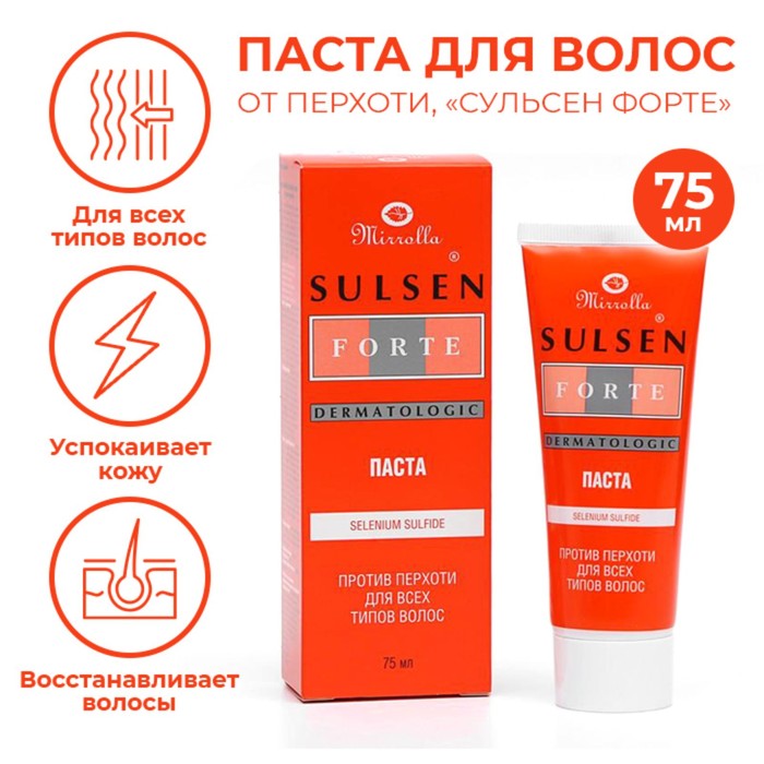 Способ применения: вымыть волосы шампунем Mirrolla Sulsen Forte. Тщательно втереть пасту массажными движениями в корни волос. Выдержать на волосах 5-10 минут, смыть тёплой водой.