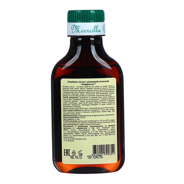 Репейное масло – активное средство для ухода за кожей головы и волосами всех типов. Масло содержит природный инулин, богатый комплекс витаминов, протеины, жирные кислоты, дубильные вещества и минеральные соли. Ромашка известна как средство для укрепления и улучшения структуры волос. Интенсивно восстанавливает волосы, придает им естественный блеск и наполняет жизненной энергией.