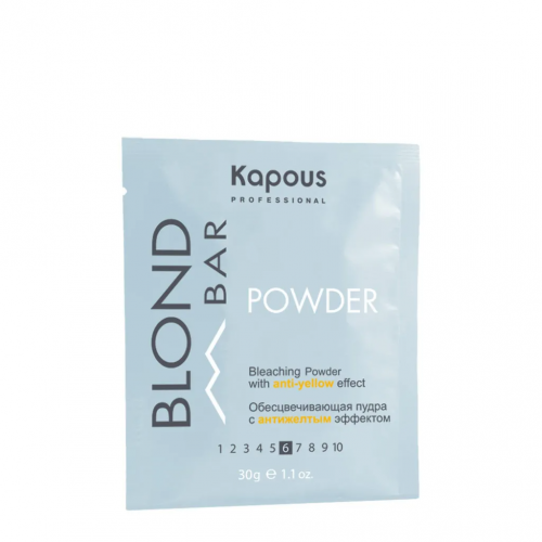 KAPOUS ( Капус ) Обесцвечивающая пудра с антижёлтым эффектом Kapous серии "Blond Bar" обесцвечивает натуральные волосы до 6 тонов. Ухаживающий комплекс, состоящий из каолина и жидкого парафина, снижает риск возникновения аллергических реакций, предотвращает иссушение и повреждение волос, оставляя их максимально увлажнёнными. Антижёлтый комплекс «Blue-Violet» помогает получить более чистый светлый результат. При смешивании с окислительной эмульсией пудра имеет кремообразную консистенцию. Легко наносится, не образует пыли.