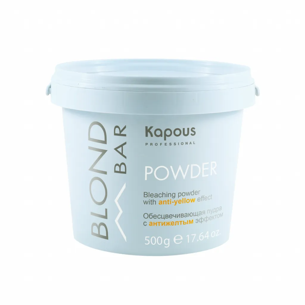 KAPOUS ( Капус ) Обесцвечивающая пудра с антижёлтым эффектом Kapous серии "Blond Bar" обесцвечивает натуральные волосы до 6 тонов. Ухаживающий комплекс, состоящий из каолина и жидкого парафина, снижает риск возникновения аллергических реакций, предотвращает иссушение и повреждение волос, оставляя их максимально увлажнёнными. Антижёлтый комплекс «Blue-Violet» помогает получить более чистый светлый результат. При смешивании с окислительной эмульсией пудра имеет кремообразную консистенцию. Легко наносится, не образует пыли.