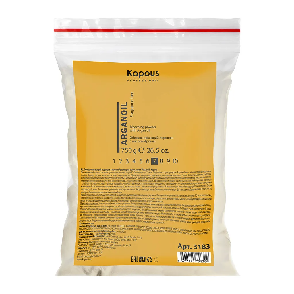 KAPOUS ( Капус ) Обесцвечивающий порошок с маслом арганы для волос. Представлен в серии продуктов «Fragrance free» − не имеет парфюмированных добавок. Подходит для всех типов волос и любых техник нанесения. Эффективно обесцвечивает окрашенные и натуральные волосы до 7 тонов. Полиненасыщенные кислоты и антиоксиданты предотвращают излишнее разрыхление волос и обезвоживание. Биополимеры обладают защитными свойствами, предотвращают повреждения волос и кожи головы.