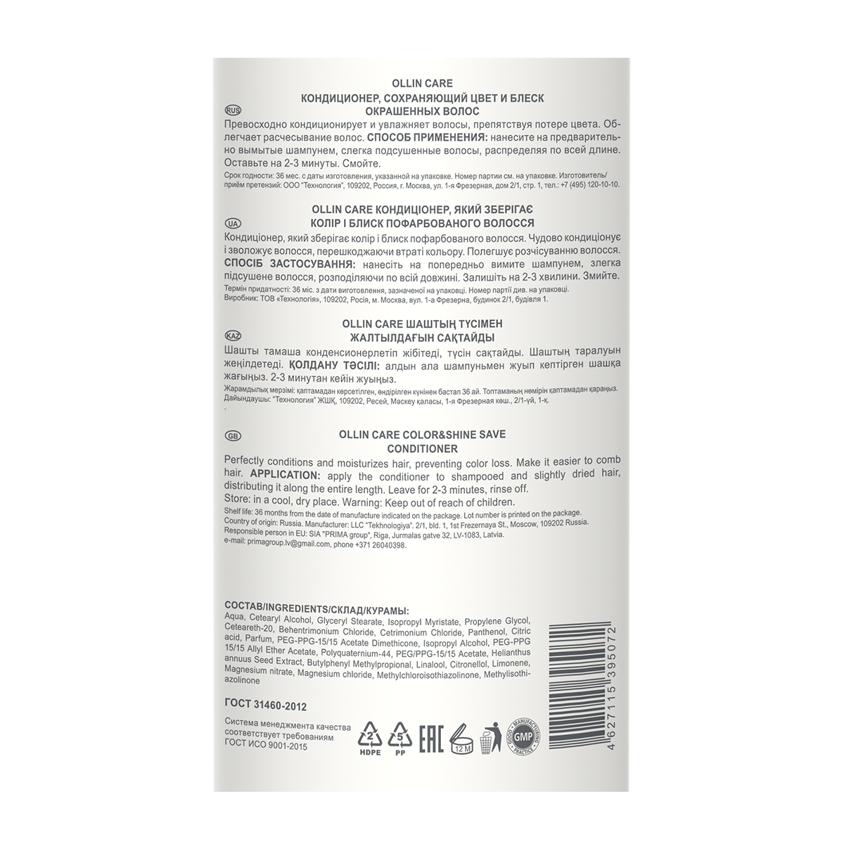 OLLIN PROFESSIONAL ( Оллин профессионал ) Кондиционер, сохраняющий цвет и блеск окрашенных волос Ollin color and shine save conditioner создан для предотвращения вымывания цвета, а также для отличного кондиционирования и увлажнения волос. Подходит кондиционер для всех типов волос. В результате кондиционера, сохраняющего цвет и блеск окрашенных волос Ollin color and shine save conditioner волосы приобретают мягкость, шелковистость и блеск, облегчается расчесывание волос.