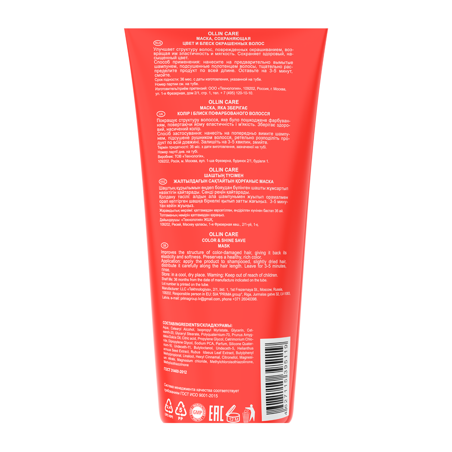 OLLIN PROFESSIONAL ( Оллин профессионал ) Маска сохраняет блеск и предотвращает вымывание цвета окрашенных волос. Оказывает увлажняющее действие. Содержит экстракт ройбуса, обладающий антиоксидантным действием и нормализующий работу сальных желез. Маска делает волосы гладкими, мягкими и эластичными, а также заметно облегчает процесс расчесывания.