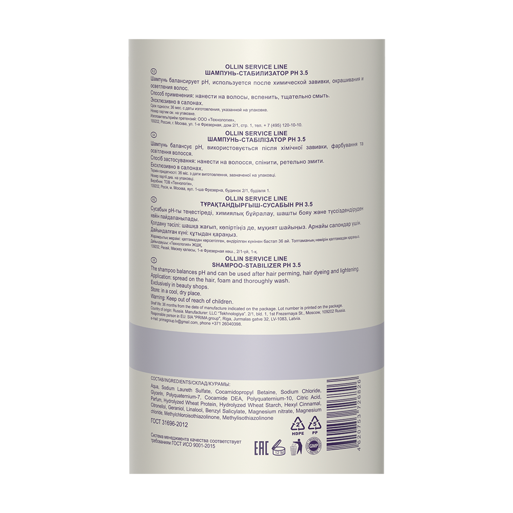 OLLIN PROFESSIONAL ( Оллин профессионал ) Шампунь-стабилизатор рН 3.5 Ollin shampoo-stabilizer разработан профессионалами специально для восстановления гидробаланса кожи головы и волос непосредственно после проведения процедуры химической завивки, осветления или окрашивания волос. Продукт отлично подходит как для коротких, так и для длинных волос, а также для волос любого типа.
