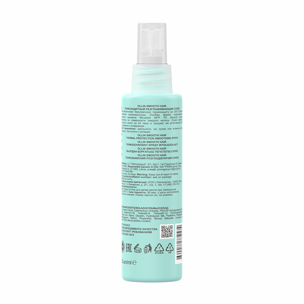OLLIN PROFESSIONAL ( Оллин профессионал ) Спрей термозащитный разглаживающий обеспечивает естественный блеск и эффект послушных волос на 24 часа. Благодаря специальной микроэмульсии, входящей в его состав, обладает безупречным термозащитным фактором до 220 градусов. Особая форма гидролизованного кукурузного крахмала Mirustyle MFP PE, входящая в его состав, образует защитную микропленку, запечатывает поверхность каждого волоса и защищает его от повреждений и ломкости. Не склеивает и не утяжеляет волосы.