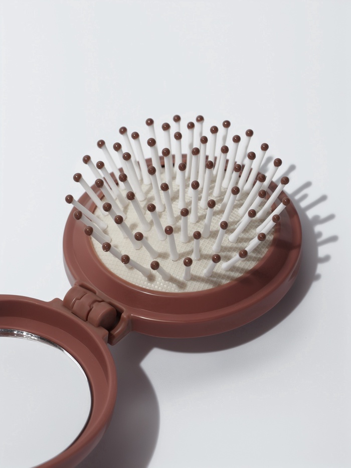 Расчёска отличается прочностью и эргономичностью. Её круглая форма обеспечивает удобство хранения, а рисунок на поверхности добавляет особого шарма. Складной механизм позволяет легко поместить её в косметичку или карман, не занимая много места.
