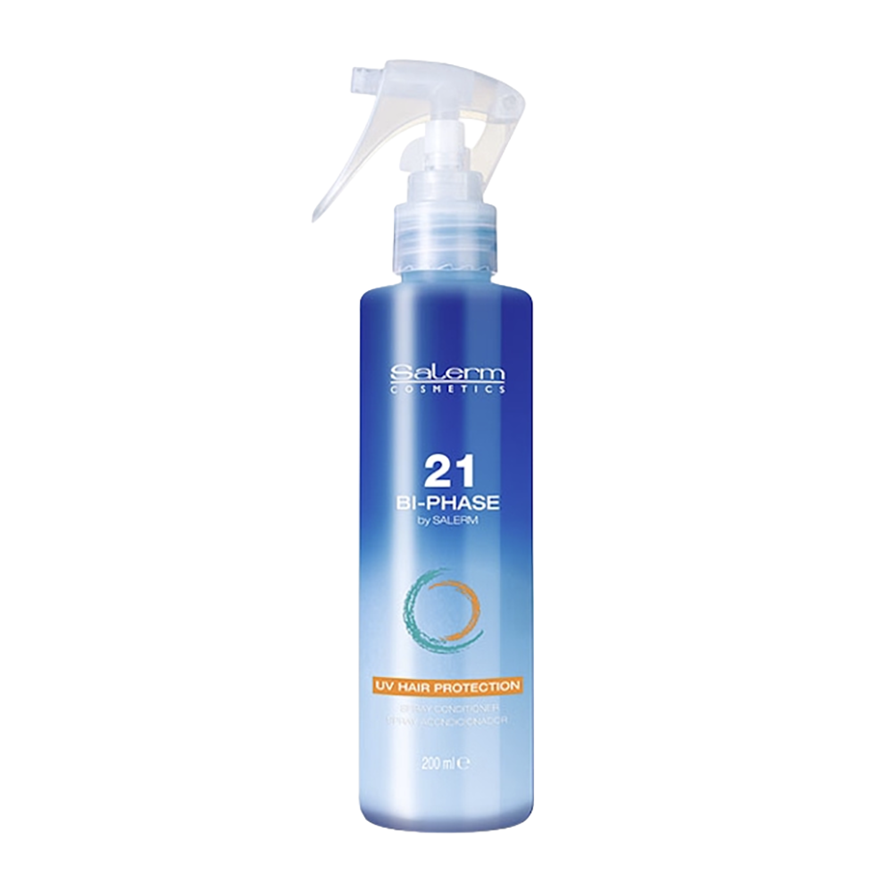 SALERM COSMETICS ( Салерм Косметикс ) Двухфазный кондиционер Salerm 21 разработан специально для защиты структуры волос от воздействия солнца, хлора и соли, а также для кондиционирования, предотвращения спутывания и мгновенного восстановления волос. Оригинальная формула с двойным эффектом и УФ-фильтром длительного действия в формате спрея. Первая фаза защищает структуру и цвет волос, сохраняет блеск и яркость, с эффектом нейтрализации желтизны. Вторая фаза увлажняет, восстанавливает, мгновенно разглаживает, снимает статичность волос, предотвращает проникновение в волосы хлора, солей и металлов, присутствующих в воде. Улучшает результат и увеличивает стойкость после технических процедур. Результат: здоровые, сильные и защищенные волосы.