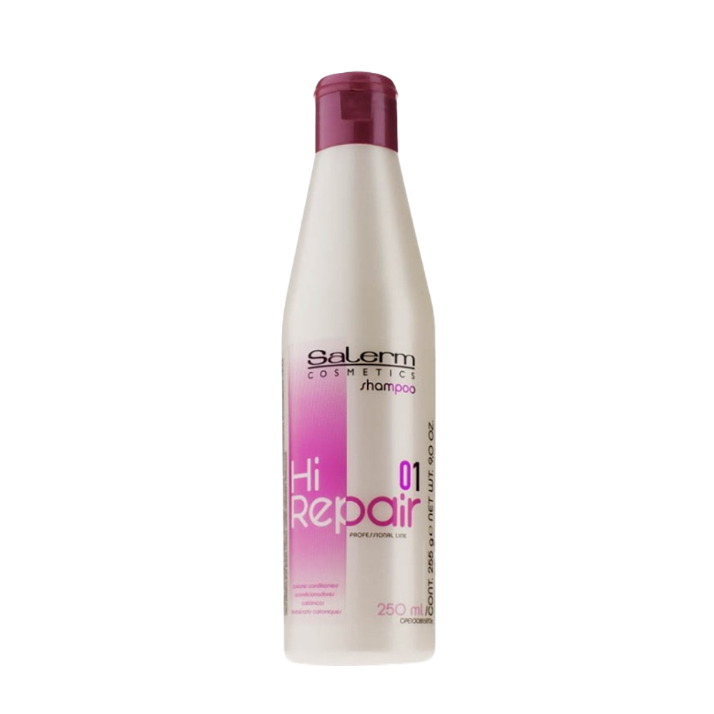SALERM COSMETICS ( Салерм Косметикс ) Шампунь Hi Repair бережно очищает волосы и кожу головы. Активизирует процесс восстановления структуры волос с первых секунд применения. Содержит кондиционеры катионного действия, которые продлевают увлажняющий эффект шампуня. Формула продукта последовательного действия Hair Care System возвращает первозданную красоту и блеск обезвоженным и поврежденным волосам.