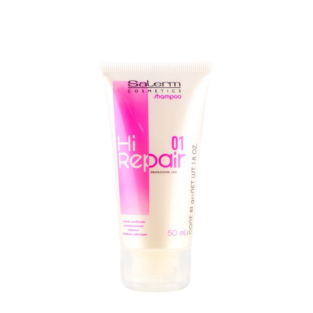SALERM COSMETICS ( Салерм Косметикс ) Шампунь Hi Repair бережно очищает волосы и кожу головы. Активизирует процесс восстановления структуры волос с первых секунд применения. Содержит кондиционеры катионного действия, которые продлевают увлажняющий эффект шампуня. Формула продукта последовательного действия Hair Care System возвращает первозданную красоту и блеск обезвоженным и поврежденным волосам.