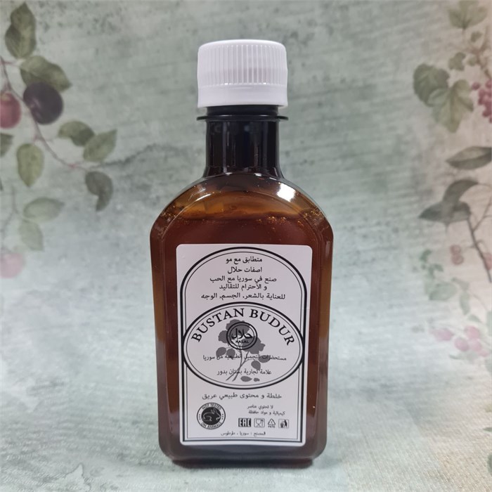 Состав: оливковая эмульсия из оливок сорта Абу-Саттл (Olive emulsion), отвар сухой смеси из: яблока сирийского, сирийской груши, цветов апельсина, цветов хризантемы, цветов жасмина, цветов розы дамасской, цельного апельсина, цельного мандарина, листа кафир-лайма, масло природной смолы ладана (Boswellia carterii), масло и пудра природной смолы горькой мирры (Commiphora myrrha) и сладкой мирры Опапонакс (Commiphora erythraea), масло листьев тимьяна линалоольного (Thymus vulgaris), молотые листья рыжика мелкоплодного (Camelina microcarpa), масло листьев шалфея лекарственного (Salvia officinalis), воск семян жожоба (Simmondsia Chinensis), масло семян броколли (Brassica oleracea), масло семян сасанквы (Camellia sasanqua), гидролат семян моркови (Daucus carota), пудра белого и красного мыльного корня (Gypsophila), пудра смолы ладанника ладанного(Cistus salviifolius).