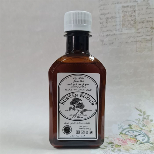 Состав: эмульсия из оливок сорта Абу-Саттл, жидкий экстракт ягод лавра Laurus nobilis, отвар лекарственной ромашки, отвар сухой смеси из: яблока сирийского, сирийской груши, цветов апельсина, цветов хризантемы, цветов жасмина, цветов розы дамасской, цельного апельсина, цельного мандарина, листа кафир-лайма, цельное масло омашки, виноградных косточек, масло лесного ореха Corylus avellana, масло сирийской бесцветной хны Lawsōnia inērmis, выжимка массы цветков календулы Calendula officinalis, настой мякоти финика Phoenix dactylifera, масло семян и мякоти инжира Fícus cárica, масло черного тмина Nigēlla satīva, масло оливки зеленой, смола мирры оманской, камедь абрикосового дерева, камедь персика, камедь груши сирийской, камедь фисташкового дерева, красный мыльный корень (порошок), орехи шикакай (отвар).