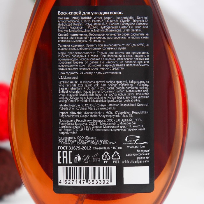 Воск-спрей отлично справляется с непослушными и пушистыми волосами, не склеивая их. Кератин в составе делает волосы гладкими и блестящими, пшеничные протеины придают шелковистость и сияние.