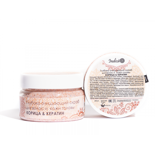 Скраб Indica с Корицей и Кератином. Готовит кожу к действию компонентов шампуня, бальзама или маски. Усиливает их. Улучшает процесс обновления кожи головы, стимулирует быстрый рост волос и восстанавливает природный блеск, облегчает процесс расчесывания, питает и оздоравливает кожу. Мощный детокс-эффект с фитонутриентами корицы и укрепление стержня волос кератином.