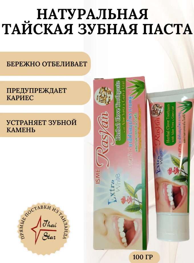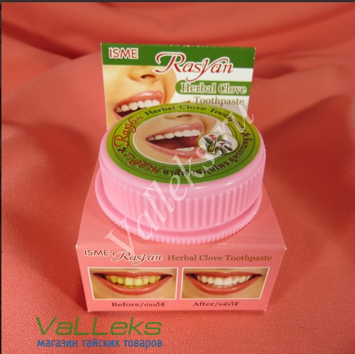 RasYan Herbal Clovee - натуральная зубная паста, которая содержат только натуральные компоненты. Входящее в состав эфирное масло гвоздичного дерева - очень эффективное обезболивающее и регенерирующее средство. Она не содержит соды, отдушек, отбеливателей, красителей и искусственных подсластителей. Подходит как и для дневного, так и для вечернего ухода. Данная паста отлично очищает зубы, бережно полирует эмаль, не повреждая ее. Паста хорошо подходит для чувствительных десен, она оздоравливает десны, снижает их чувствительность и устраняет кровоточивость. Ежедневное применение данной зубной пасты поможет устранить зубной камень, а также темный налет от чая и кофе. Предупреждает развитие кариеса, надолго сохраняет чистоту зубов и свежесть дыхания.