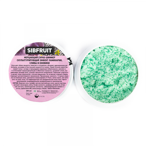 Мерцающий скраб-шиммер SIBFUIT усиливает микроциркуляцию и обменные процессы, устраняет отеки, выравнивает рельеф кожи, снимает мышечное напряжение. Повышает упругость и делает кожу подтянутой. Не оставляет жирных следов, подходит для регулярного применения.