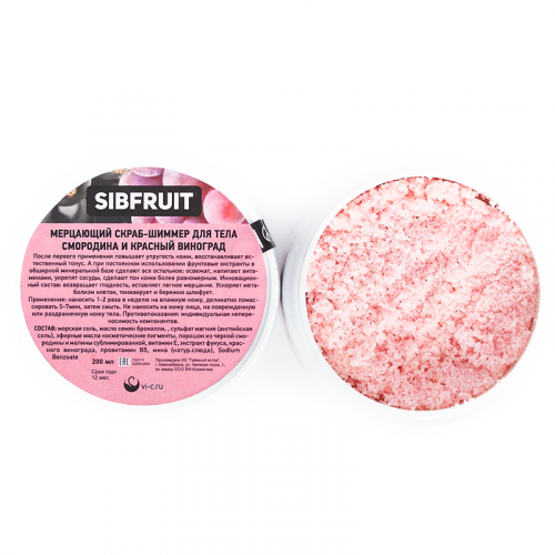 Регулярное обновление клеток кожи с помощью Скраб-Шимера SIBFRUITS активирует базовые обменные процессы организма: регенерацию и омоложение. После первого использования повышается упругость кожи, восстанавливается естественный тонус. А при постоянном применении фруктовые экстракты в обширной минеральной базе сделают все остальное: освежат, напитают витаминами, укрепят сосуды и даже тон кожи сделают более равномерным. Соки смородины и красного тайского винограда ускоряют клеточный метаболизм. В целом применение скраб-шиммера очень эффективно в борьбе с проявлениями целлюлита и восстановлении после беременности.