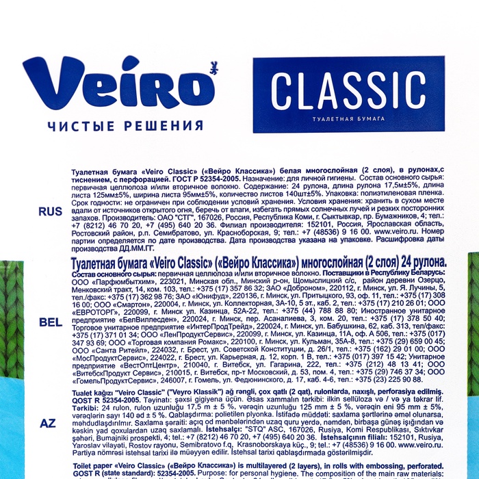 Туалетная бумага Linia VEIRO Classic, белая, 2 слойная, 24 шт.