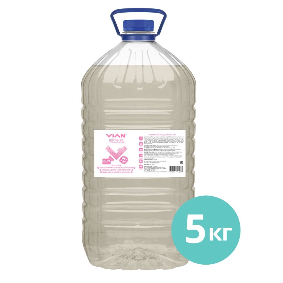 Гель для душа без SLS на розлив, тара 5 кг - экономичная упаковка средства. Содержит объём более 16 обычных упаковок гелей для душа VIAN.