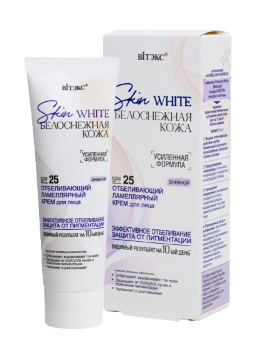 Представляем вашему вниманию отбеливающий ламеллярный крем для лица SKIN WHITE. Этот уникальный продукт способен не только осветлить вашу кожу, но и поддерживать её youthful beauty благодаря специальной формуле с антивозрастными компонентами. Крем подходит для дневного использования и обладает высоким уровнем защиты от UV-излучения с SPF25, что делает его идеальным помощником в борьбе с вредными солнечными лучами.