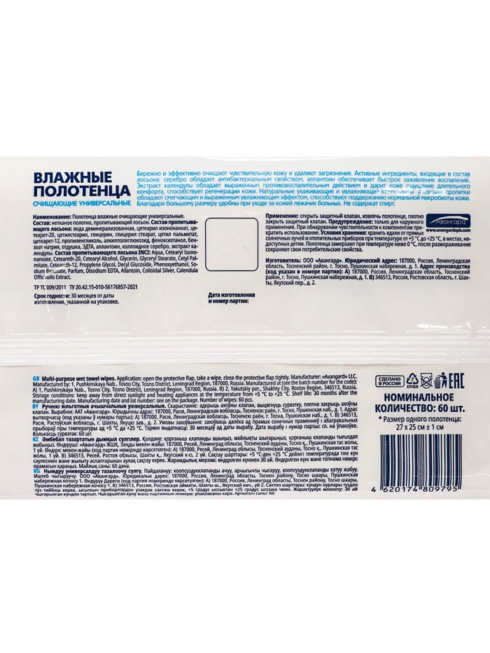Влажные полотенца XXL, очищающие, универсальные, с календулой, 60 шт.