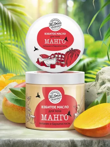 Взбитое масло «Манго» интенсивно питает и увлажняет кожу, делает ее эластичной, упругой и бархатистой на ощупь, устраняет сухость, шелушение, воспаление, способствует заживлению микроповреждений, предотвращает появление растяжек, дарит яркий, тропический аромат манго.