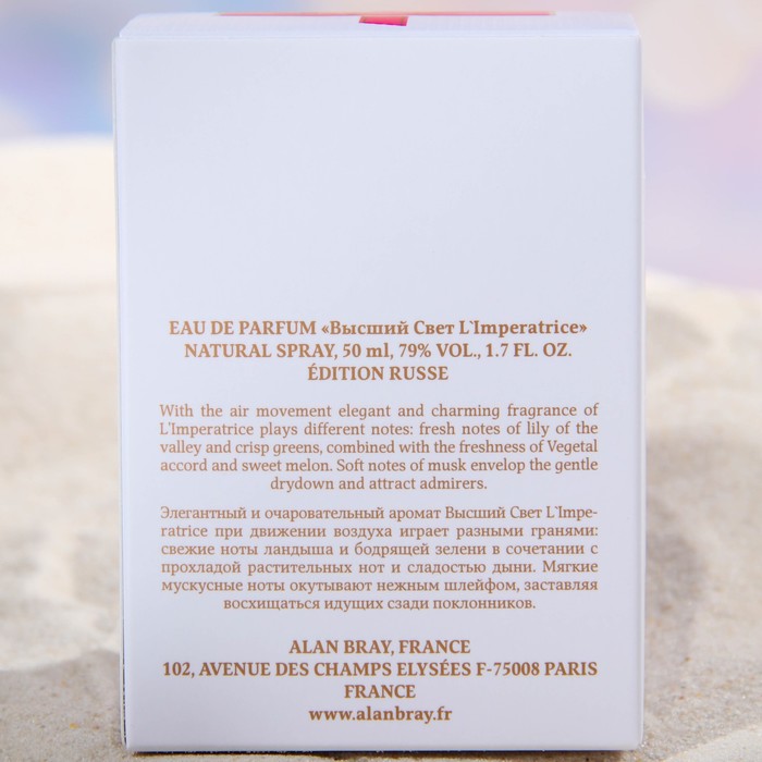 Элегантный и очаровательный аромат «Высший Свет» L`Imperatrice при движении воздуха играет разными гранями: свежие ноты ландыша и бодрящей зелени в сочетании с прохладой растительных нот и сладостью дыни. Мягкие мускусные ноты окутывают нежным шлейфом, заставляя восхищаться идущих сзади поклонников.