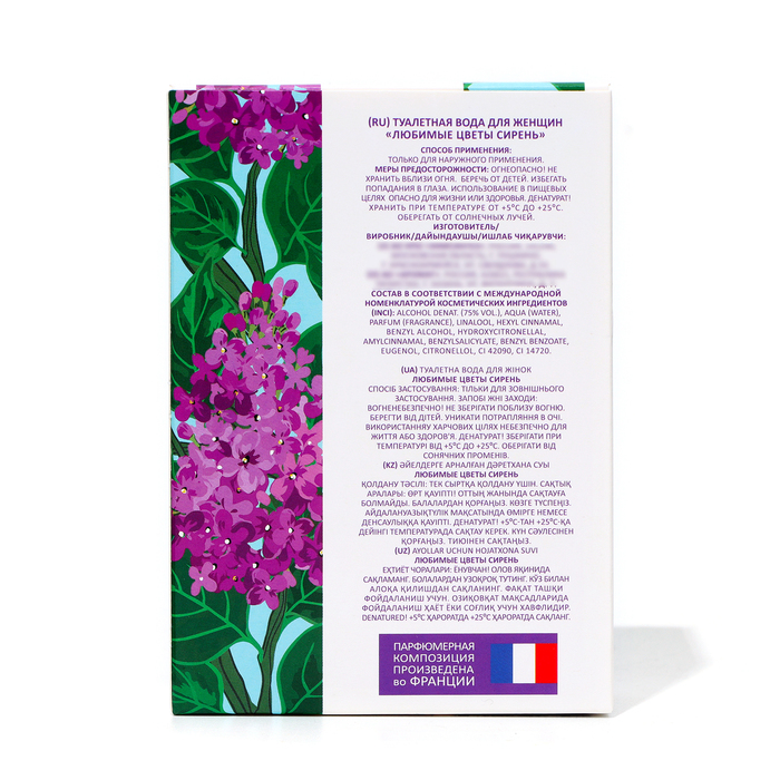 Начальные ноты туалетной воды раскрываются свежими и сочными аккордами сирени, придающими аромату легкость и яркость. В сердце композиции расцветают более насыщенные оттенки сирени, создавая чувственное и элегантное впечатление. Базовые ноты придают аромату стойкость и завершают этот удивительный букет.